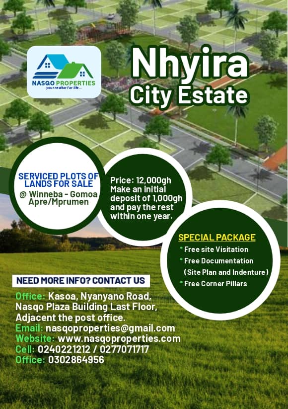Nhyira City Estate is where life offers you the opportunity to blend nature seamlessly with the conveniences of modern living. This carefully planned 385‑acre eco‑friendly community is located in the lush, serene enclave of Winneba – Gomoa Apre/Mprumen. The development offers fully serviced plots designed to provide a sustainable and organic lifestyle, freeing you from the burdens of infrastructure development. Nhyira City Estate is more than just a residential area; it is a model community created in response to the high demand from discerning homeowners. Nasqo Properties has ensured that essential infrastructure—including electricity, water, Transport yard for easy mobility, sidewalks, a green park, efficient drainage, a secure gate post, perimeter fence wall, and ambient street lighting—is already in place. This allows residents to focus entirely on designing and building their dream homes while embracing a holistic, stress-free way of life from day one. Nhyira City Estate also provides flexible and convenient payment terms, making it easier for homeowners to secure their ideal plots. The community is strategically located with easy access to nearby towns, schools, markets, and essential services, offering the perfect balance of tranquility and convenience. Embrace the ease of holistic and organic living at Nhyira City Estate, where thoughtfully planned infrastructure, natural surroundings, and a vibrant community come together to turn your dream lifestyle into reality.
